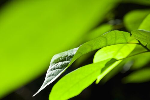 暗い林の中、一筋の光が緑の葉を照らしていました。