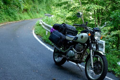 荷物を積んだCLさん。 シートバッグとサイドバッグ、三脚とテントは括り付け。サイドバッグは重量に不安があるので、ホムセンステーでバッグの底を支えるようにしています。猿壺の滝へ行く山道はこんな感じ。なんというか、ガードレールがベッコベコです。こ…