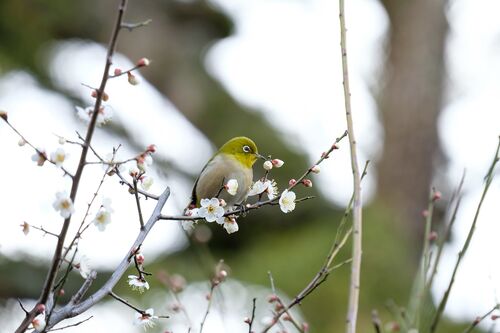 梅とメジロ。 2月の寒空の元、一足早い、春の気配。