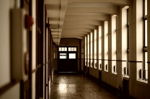 豊郷小学校、一番好みだったのは廊下です! 窓から差し込む光が廊下に鈍く反射してステキ。 そういえば校舎を外から撮った写真は撮らなかったなぁ…なんでだろ。 すごくハイカラなデザインでしたが、個人的には校舎内の方が好きだったからかな?