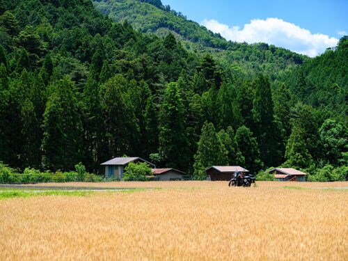 5月後半になるともち麦?の季節です。ここ数年で加東市や稲美町での栽培が進んだようで、よく見かけるんですよね。稲の田園は見慣れた風景ですが麦は珍しく、より鮮やかに見えます。なので麦畑をバックにバイクの写真を撮るのは大好きです。ちょっと外国風に…